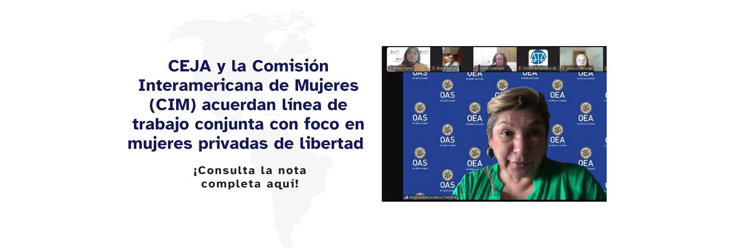 El Centro de Estudios de Justicia de las Américas (CEJA) sostuvo una reunión con representantes de la Comisión Interamericana de Mujeres (CIM) de la Organización de los Estados Americanos (OEA), con el objetivo de establecer posibles líneas de cooperación en temas vinculados al acceso a la justicia con enfoque de género. (Lea Más.)